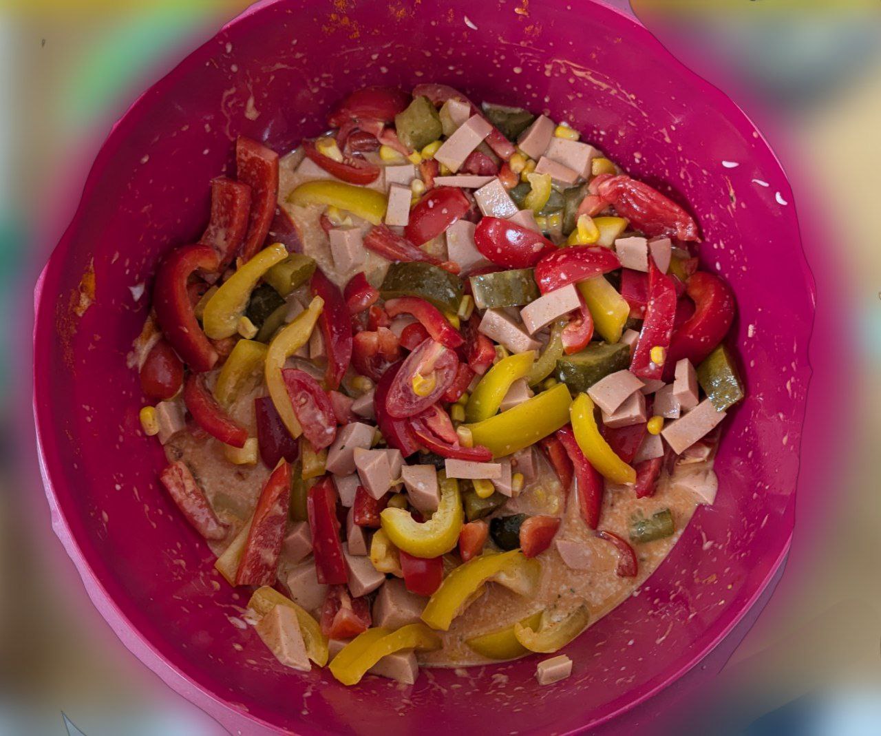 ich mach mir mal wieder einen veganen Nudelsalat mit vemondo Mayo, Hafermilch, Gurkenwasser und die vegane Fleischwurst aus dem Rewe :)